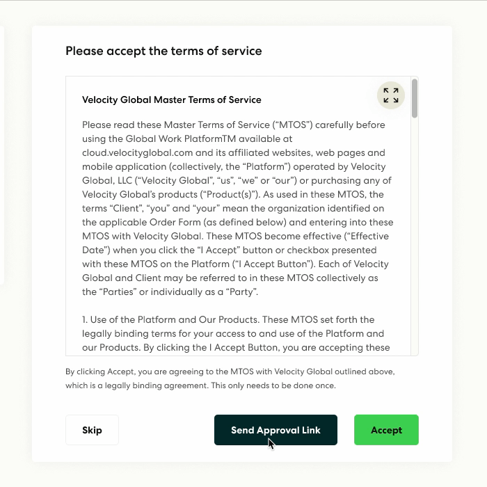 Enabled users to share the Terms of Service link with coworkers, allowing teams to review and approve the contract even when the user initiating sign-up cannot sign on their own.