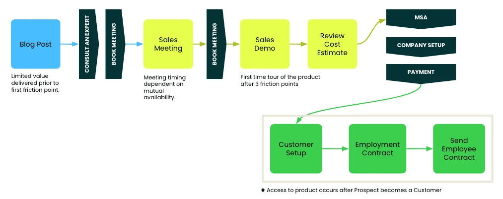 Even once a customer decides to move forward, multiple roadblocks, including meetings, paperwork, and approvals, delay their ability to access the platform and start hiring.