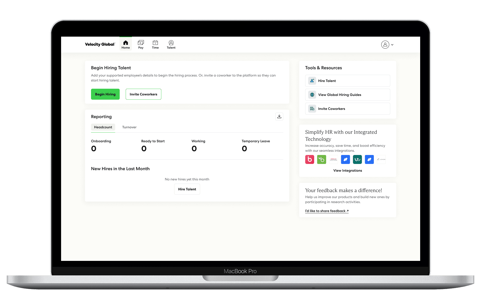 Replaced the empty data table homepage with a guided entry experience that helps new users understand what to do next. The new design introduces clear calls to action—such as Start Hiring or Invite a Teammate—and provides contextual tips, quick links, and a snapshot of reporting to build confidence and momentum.