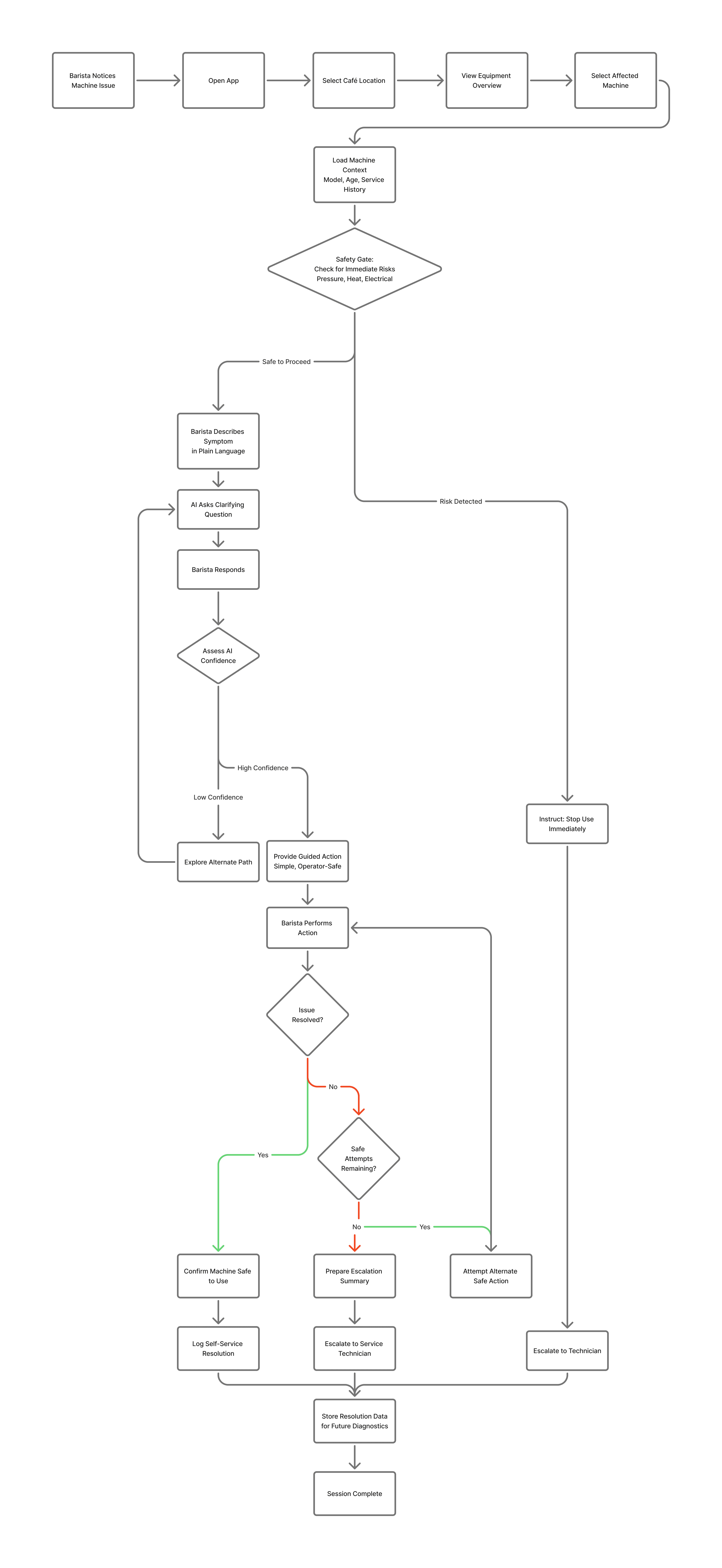Existing support options such as manuals, static troubleshooting guides, or calling a technician, are either too technical, too slow, or disconnected from the realities of a busy café environment. Baristas need a way to quickly and safely understand what’s wrong, what actions are appropriate, and when escalation is truly required.